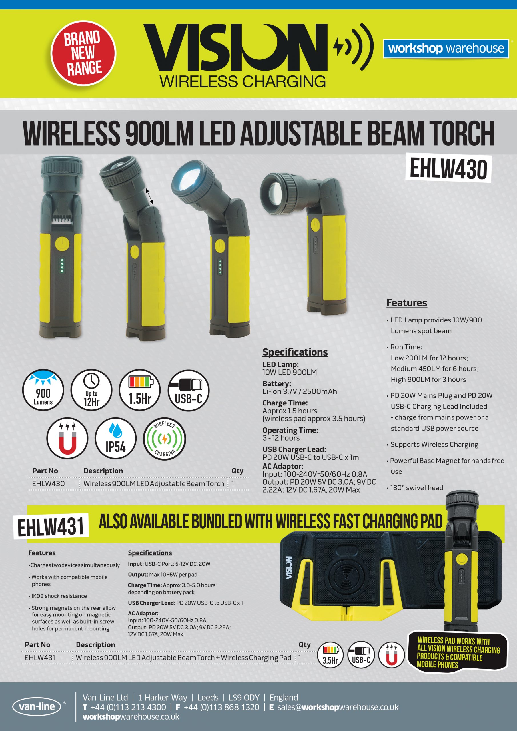 VISION EHLW430 & EHLW431 Flyer 1pp A4 leaflet promoting the VISION EHLW430 & EHLW431 wireless charging lamps. See below for the PDF download link. << return to listing