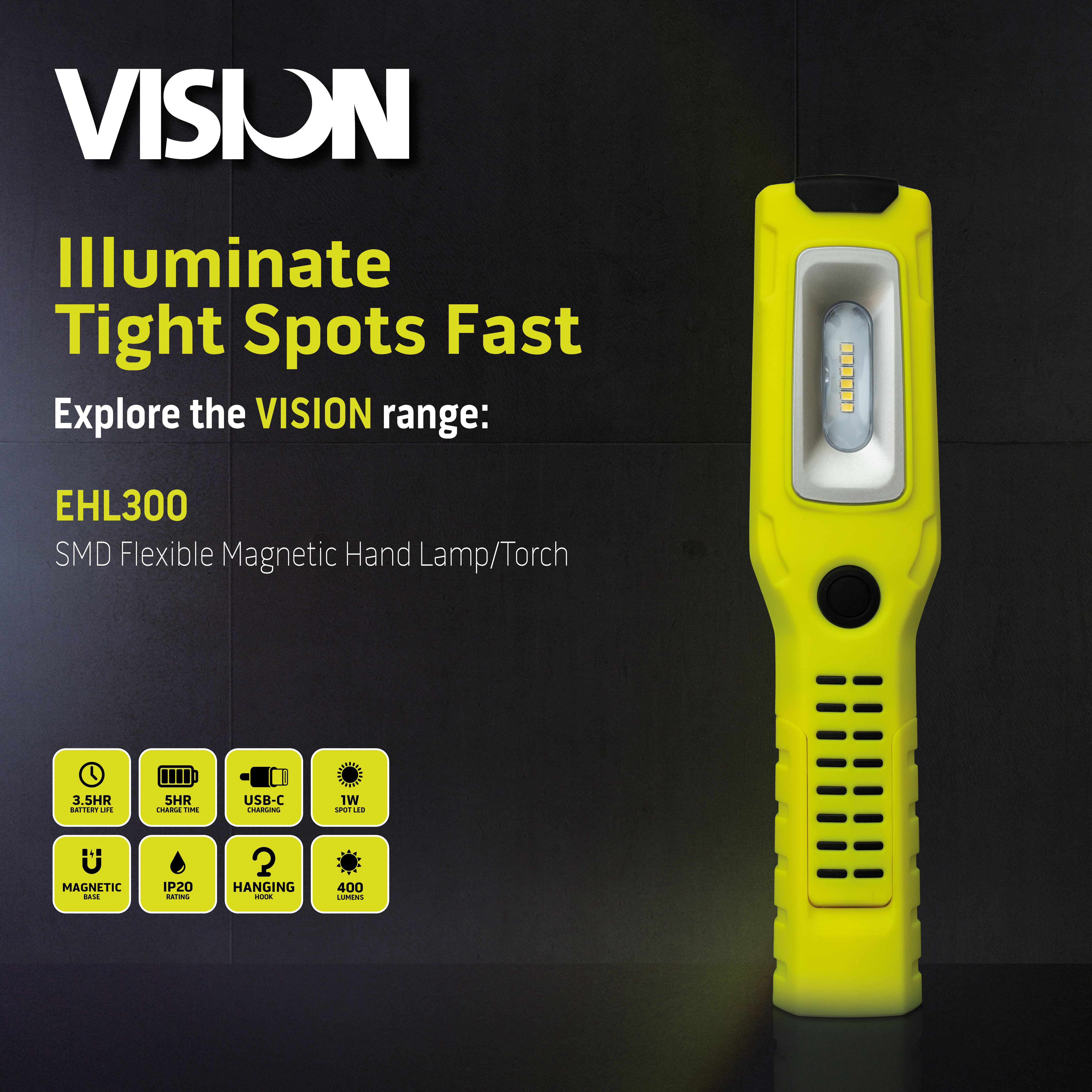When you need to see all the details. The Vision Multi Position 40 SMD LED Inspection Lamp brings a massive 1000 lm output and flexible positioning to bigger inspection tasks. With strong magnets, 360° hook and USB-C charging, it’s engineered for hands-free lighting that adapts to every angle of your work. Built for serious workshop and on-site use.