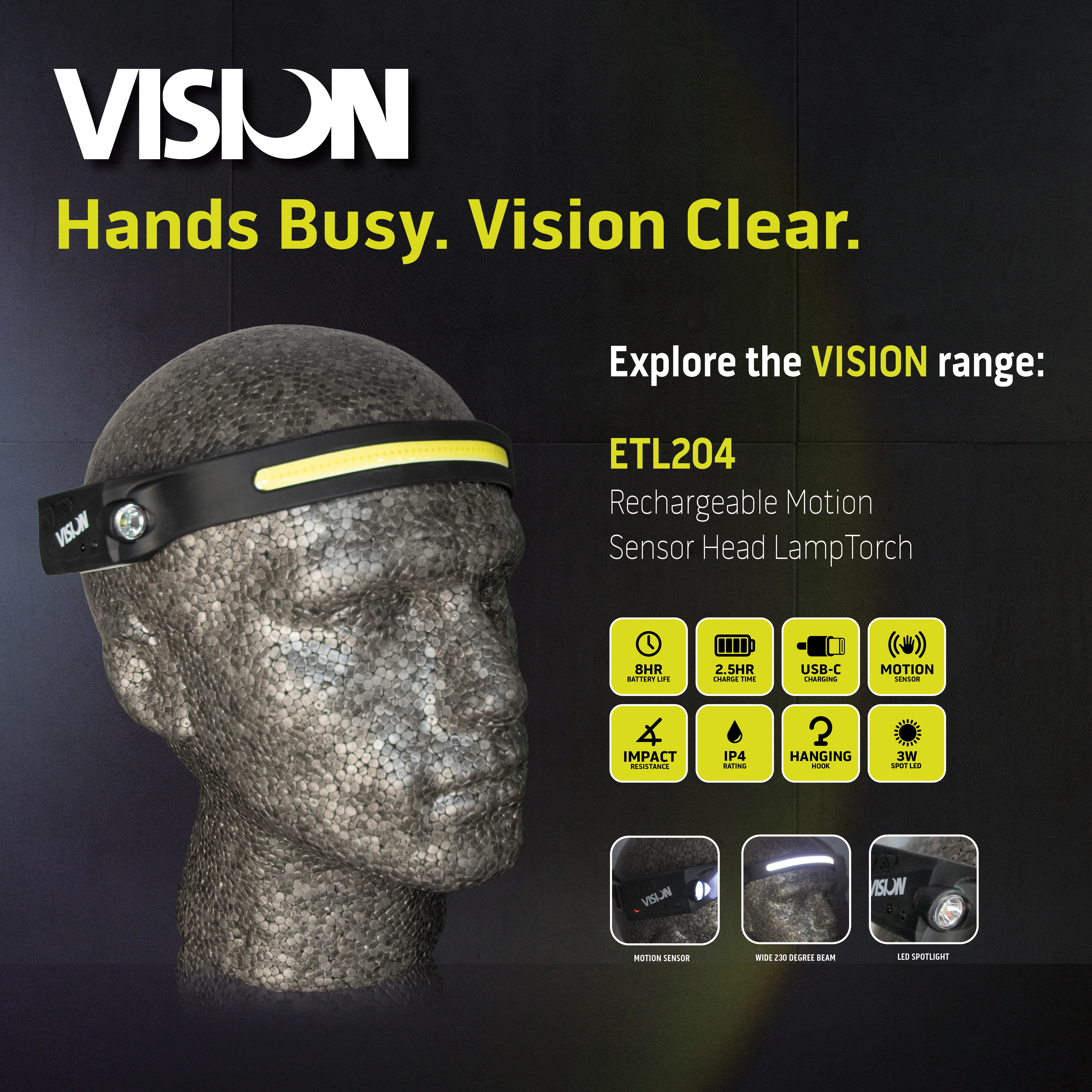 Hands-busy tasks need smart solutions. The Vision 350 lm LED Motion Sensor Head Torch gives you bright, adjustable light with motion-activated control — just wave your hand to activate. Up to 30 hrs runtime on low mode and multiple brightness levels make it reliable from quick inspections to longer shifts. Stay safe, stay focused, and keep your hands free.